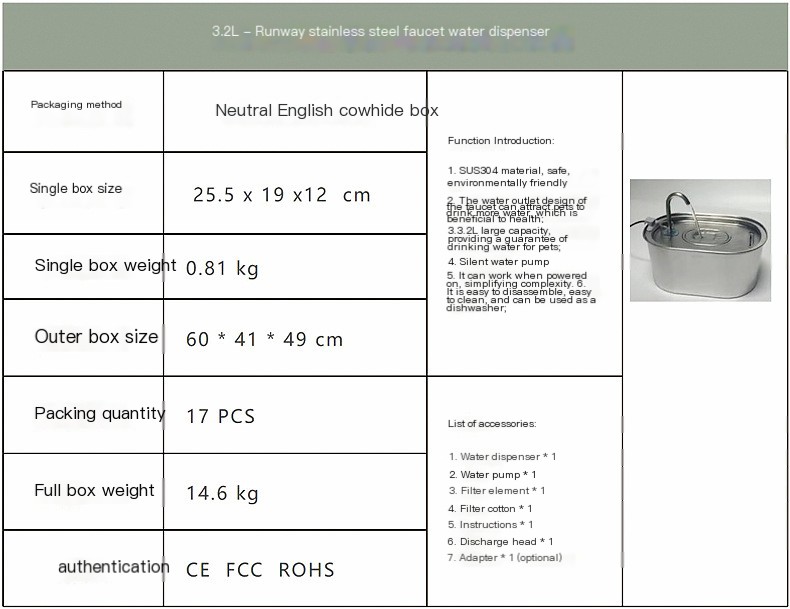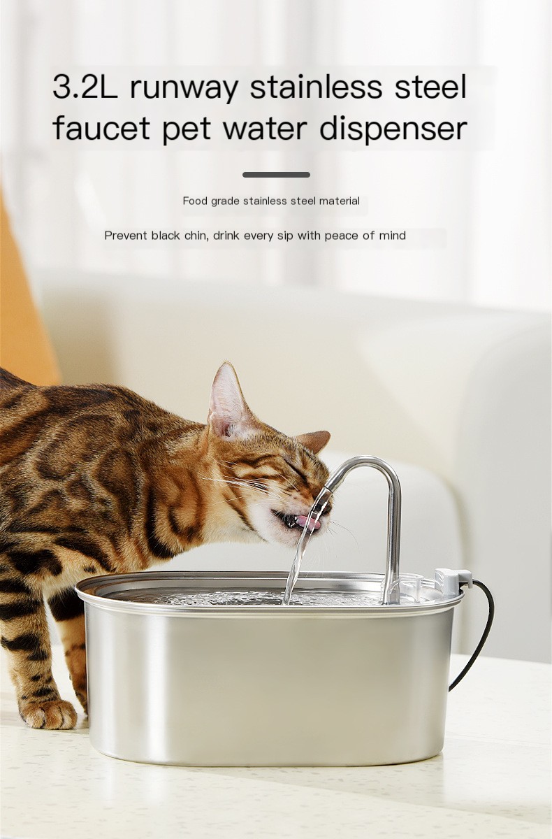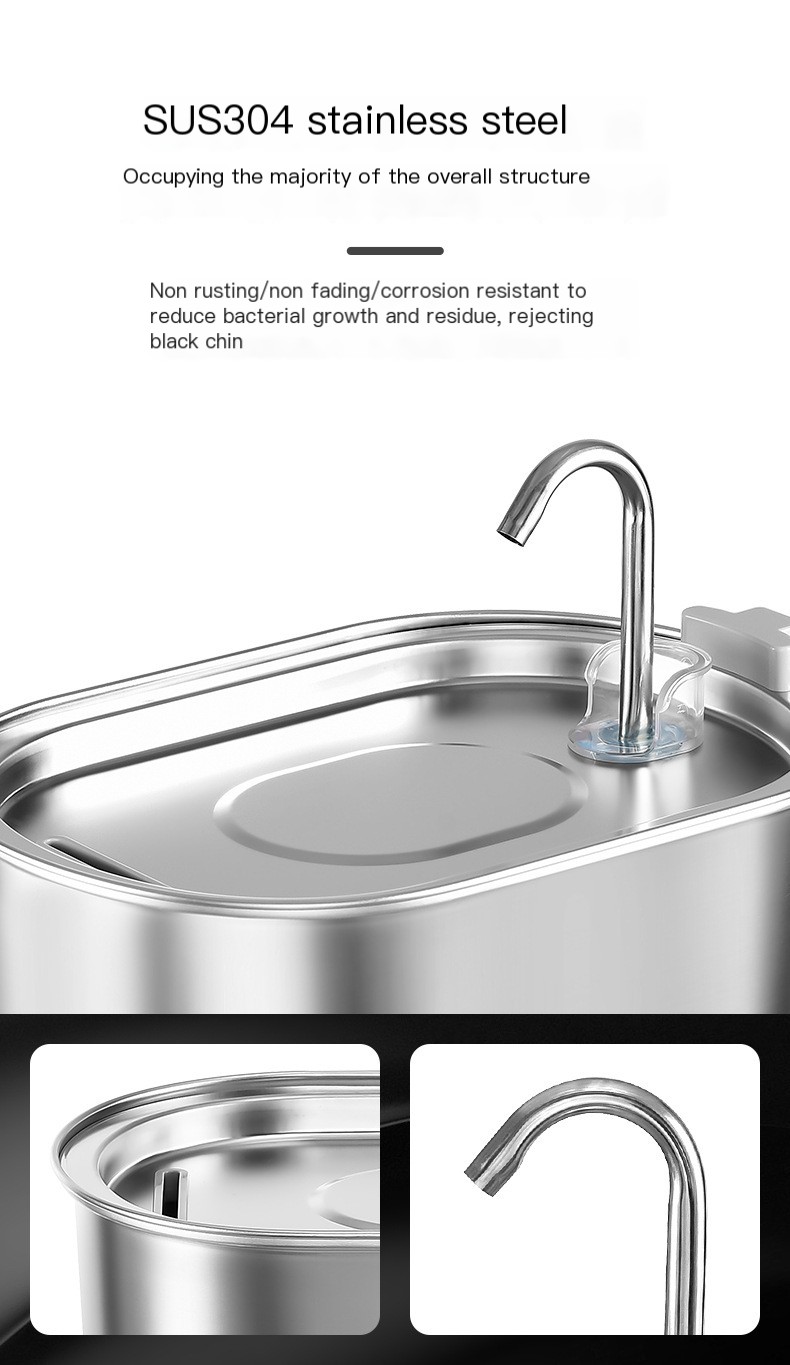 2. El diseño de salida de agua del grifo puede atraer a las mascotas a beber más agua, lo cual es beneficioso para la salud; 3 Gran capacidad de 3,2 litros, que proporciona a las mascotas una ingesta de agua garantizada;